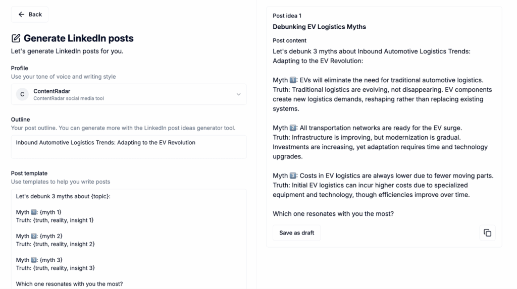 - Create content in seconds: Once you’ve selected a template and idea, AI can generate the content for you. Whether it’s a thought-provoking question, a valuable tip, or a summary of industry news, AI takes care of the hard work, so you don’t have to spend hours brainstorming and writing.