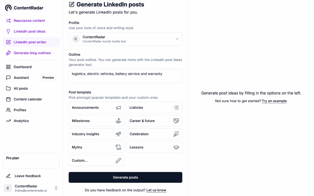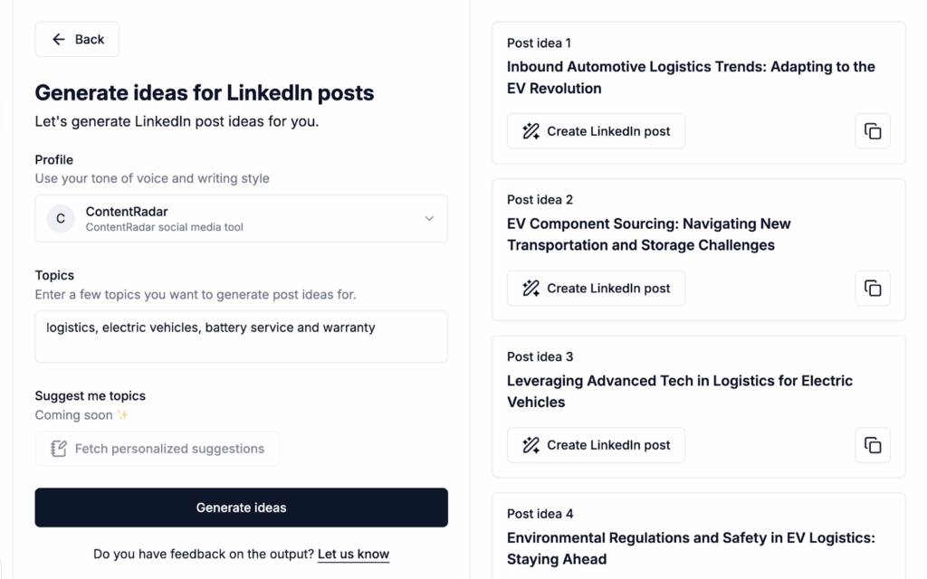 - Generate ideas in seconds: AI can help you generate post ideas tailored to your industry and audience. By analyzing trending topics, recent news, and what’s resonating with others in your network, AI can provide suggestions for posts that will engage your audience.
