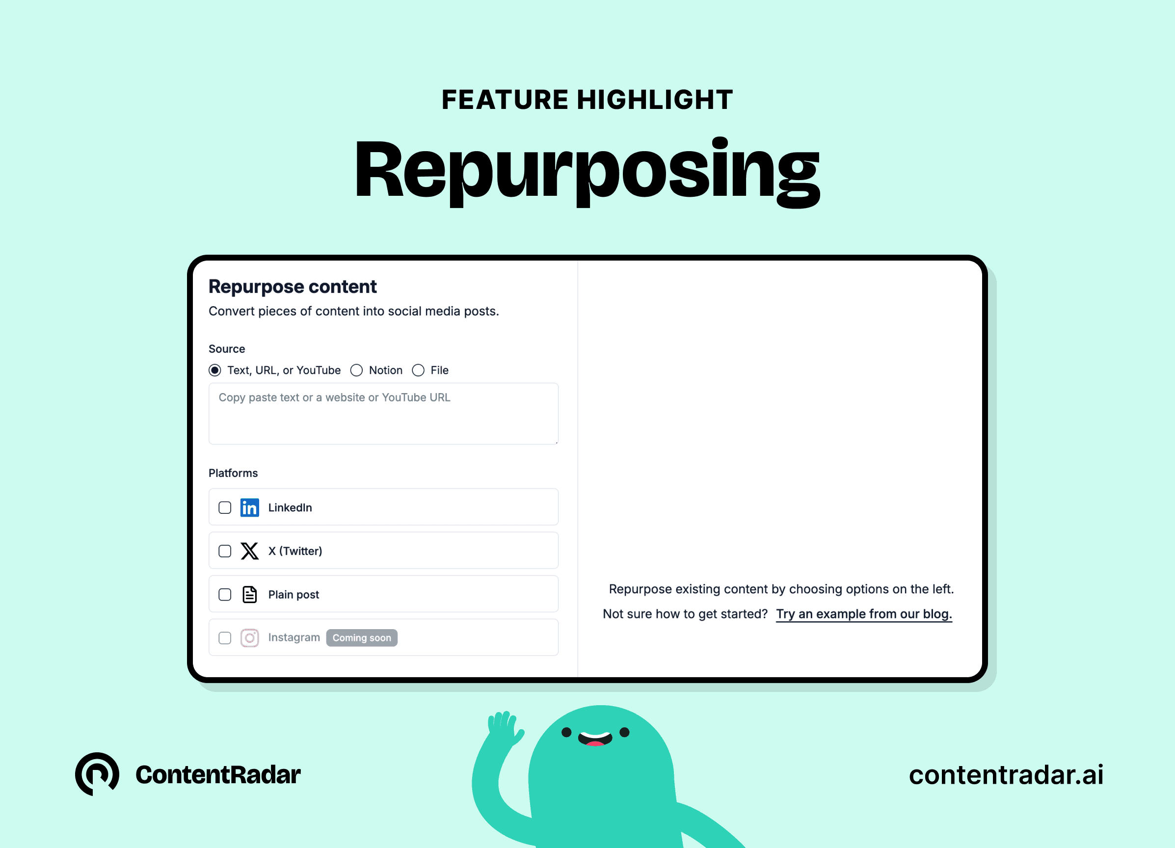 A big part of scheduling is consistency. It is often challenging to maintain a consistent posting schedule with limited content at hand. ContentRadar’s repurposing feature allows you to generate multiple content pieces from a single source in just one click. This not only saves time but also ensures that your content remains fresh and varied across different platforms. By repurposing content, you can reach different segments of your audience and reinforce your message without the need to create entirely new posts from scratch.