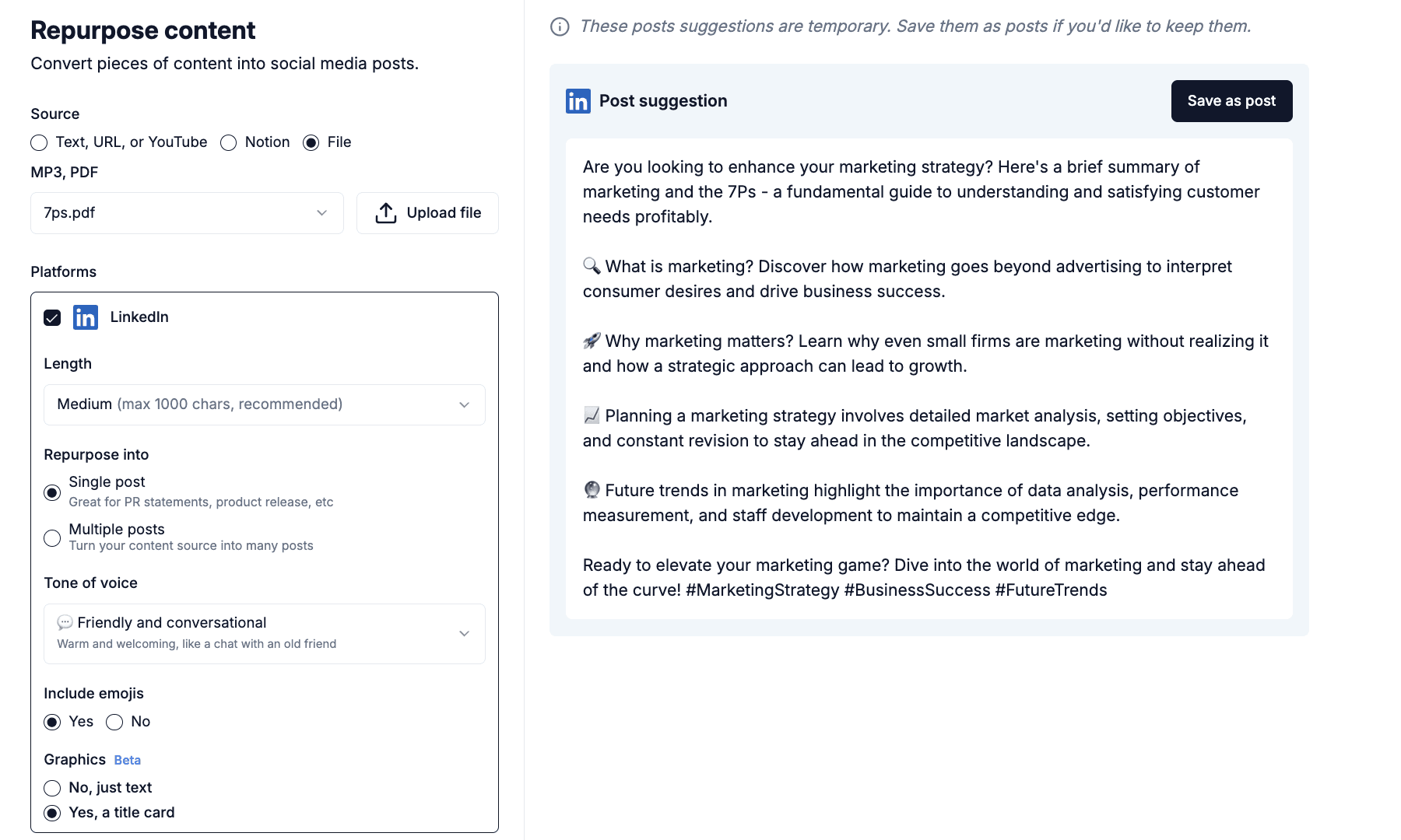 Have valuable PDF documents such as case studies or white papers that you want to share on LinkedIn? ContentRadar’s PDF repurposing feature simplifies this process. By uploading your PDF, you can quickly generate well-crafted social media posts that encapsulate the key points and insights from your document. This allows you to effortlessly transform detailed reports into engaging LinkedIn content, making it easier to reach and resonate with your audience while maintaining the integrity of your original information.