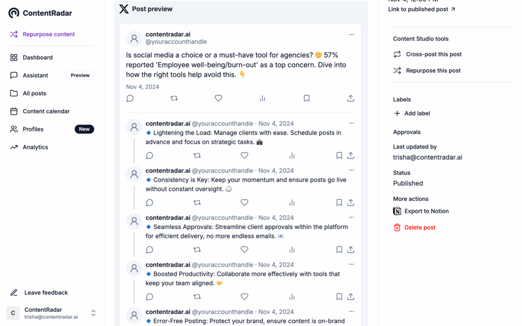 With features like previewing, scheduling, team approvals, and pre-publishing edits, ContentRadar helps you confidently publish your threads without the worry of last-minute typos or missing details. Whether you’re managing your own account or overseeing multiple clients, a tool like this allows you to deliver polished, error-free content consistently.