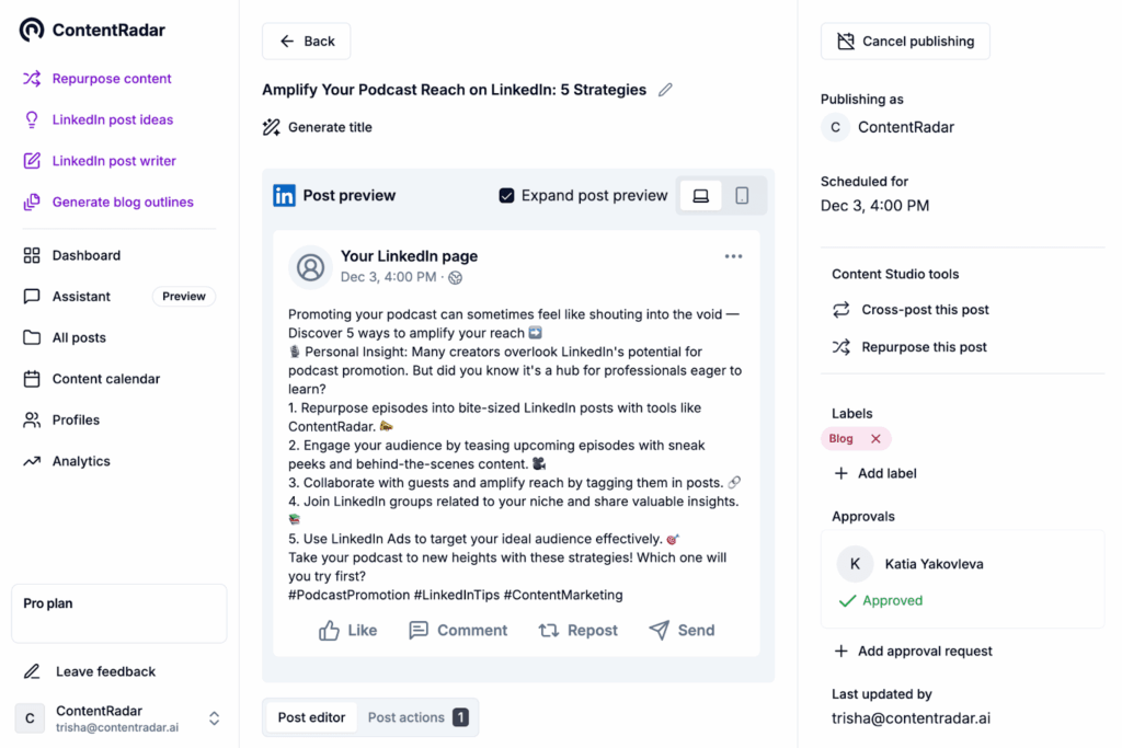 Stick to 3–5 relevant hashtags to increase visibility. ContentRadar can help suggest popular hashtags in your industry.