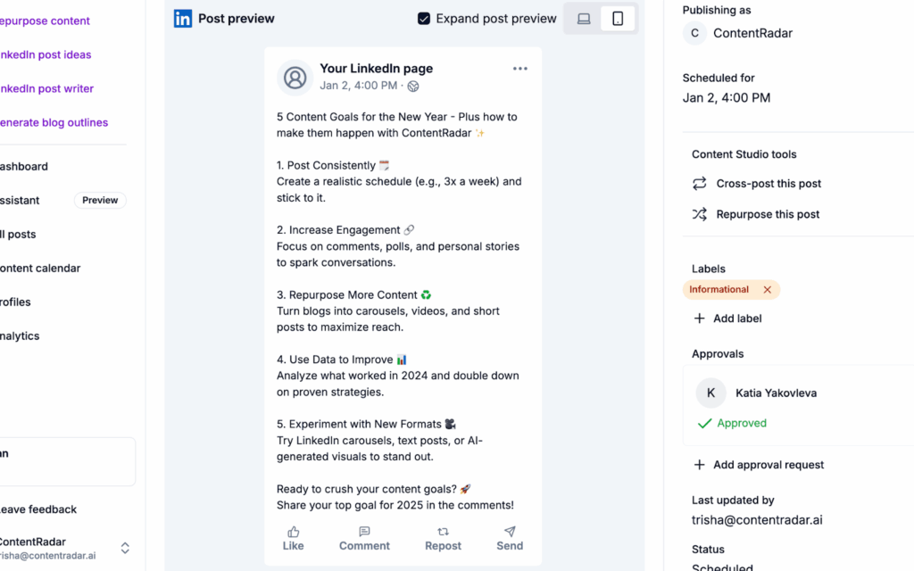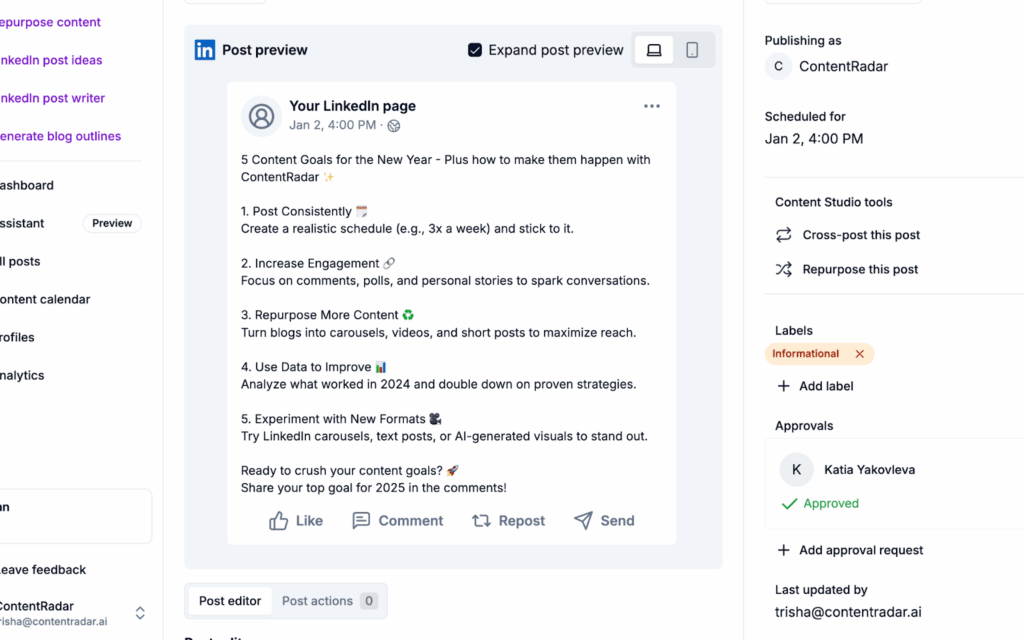 Refine your headlines, optimize your visuals, and test CTAs to maximize interaction. A preview lets you see your post through the eyes of your audience.