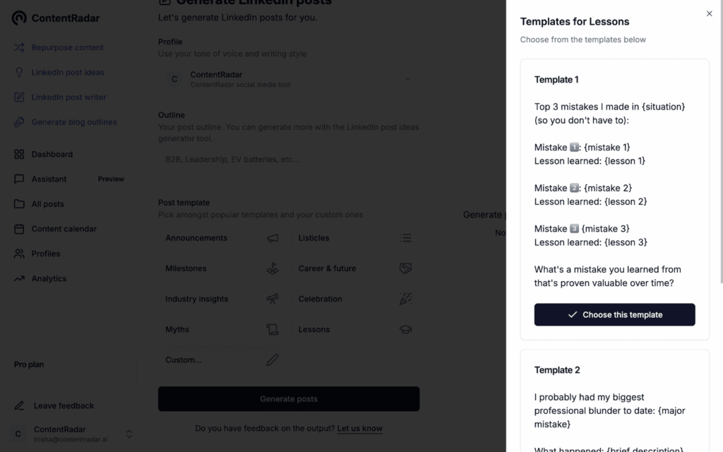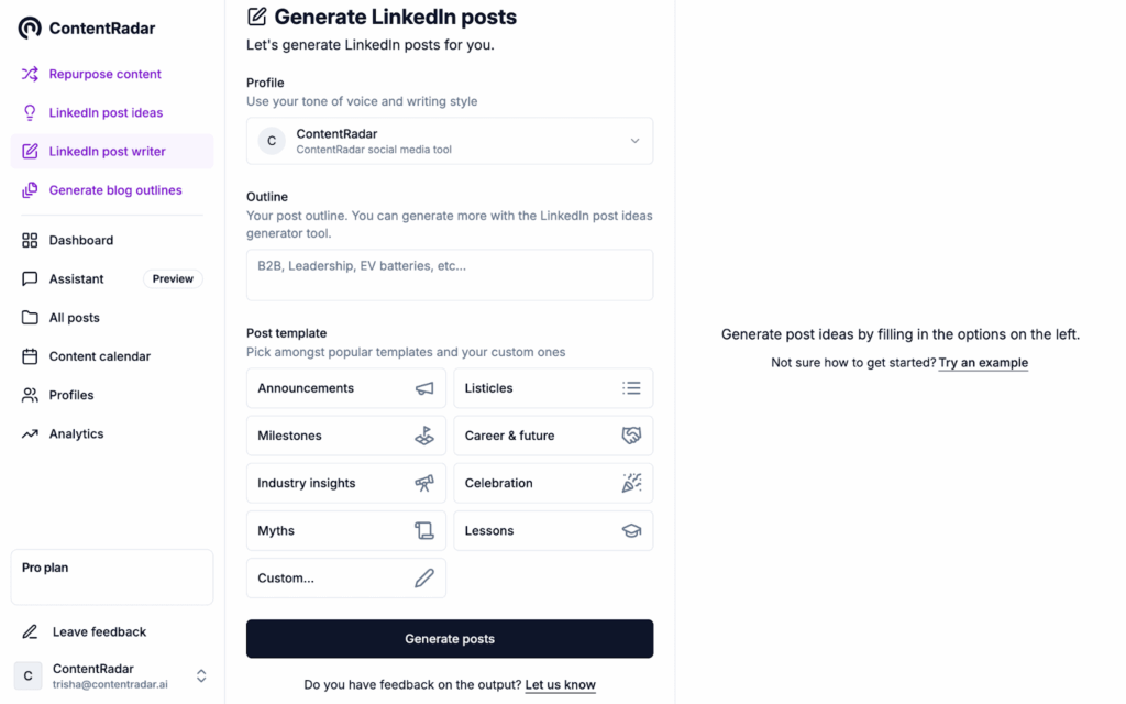 ContentRadar Tip: With the LinkedIn Post Writer, you can input a topic, and it will generate tailored posts in seconds. Say goodbye to writer’s block!