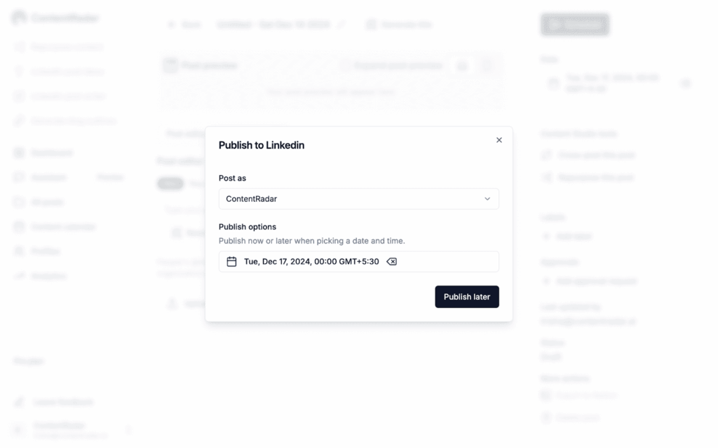 ContentRadar Tip: Use the scheduling feature to plan your posts ahead of time. This way, you stay consistent without needing to scramble for ideas every week.