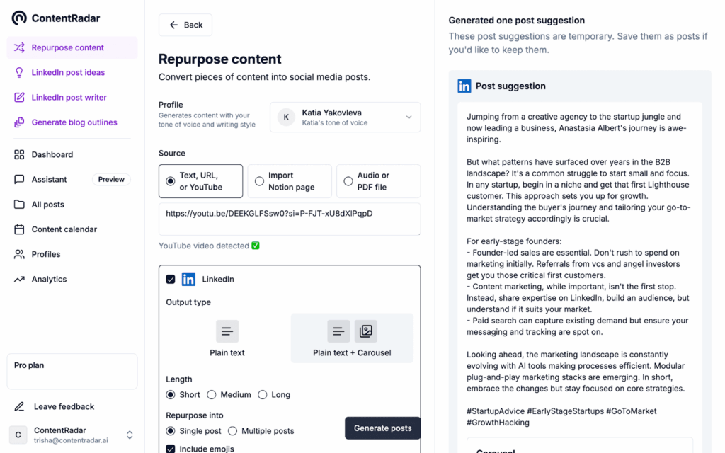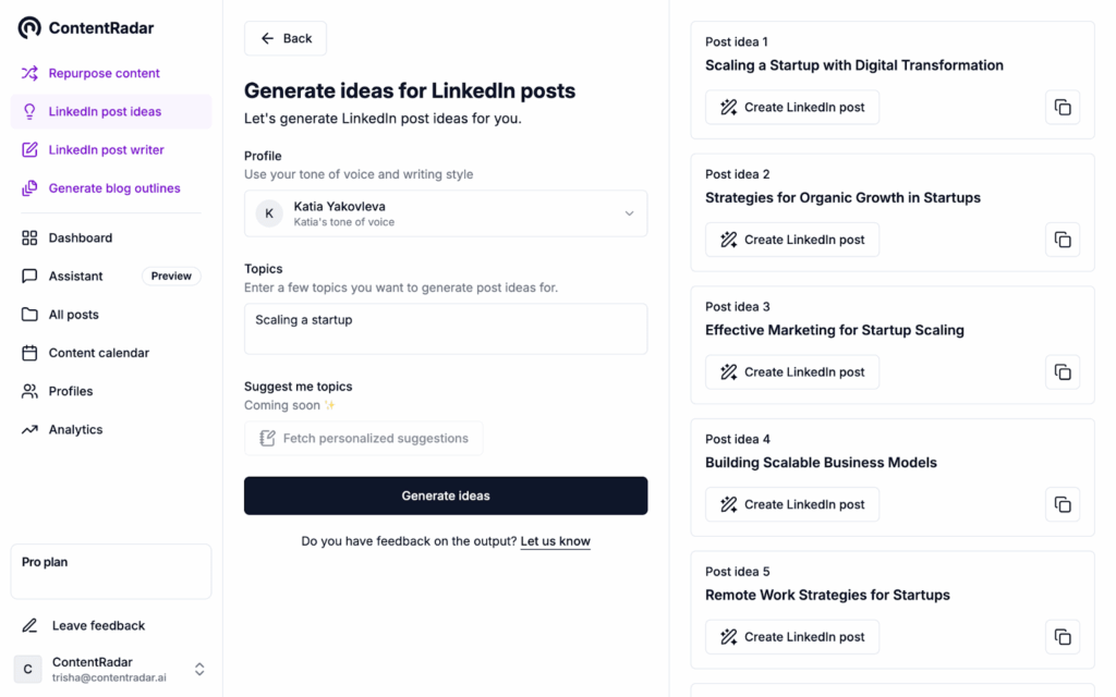 Creating founder-led content may sound overwhelming, but it doesn’t have to be. With AI-powered tools like ContentRadar, you can streamline the process, save time, and still create impactful content that reflects your unique voice.